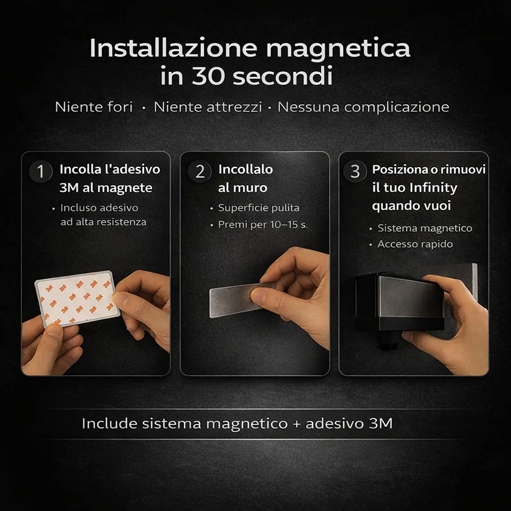 Installare il tuo Infinity™ è semplice come attaccare e posizionare.La piastra metallica si fissa alla parete con l’adesivo 3M incluso ed è pronta in pochi secondi. L’Infinity™ si aggancia automaticamente grazie alla base magnetica integrata.Nessun attrezzo, nessuna vite e nessun danno alla vernice.Puoi rimuoverlo e riposizionarlo per ricaricarlo o spostarlo quando vuoi.